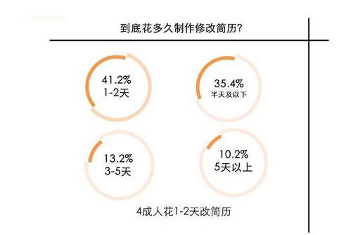根據(jù)調(diào)查顯示,41.2%的人制作修改簡歷需要1-2天;35.4%受訪者表示制作與修改簡歷的時(shí)間在半天左右;有10.2%的人制作修改簡歷的時(shí)間在5天以上。